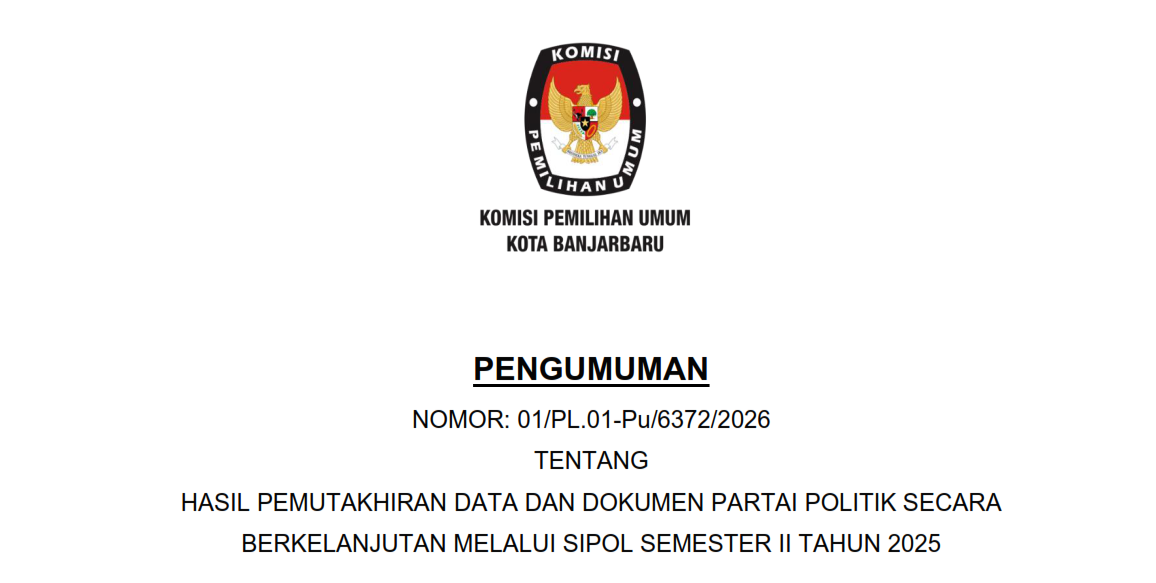Berdasarkan hasil verifikasi terhadap data dan dokumen pemutakhiran Partai Politik, KPU Kota Banjarbaru menyampaikan hasil pemutakhiran data dan dokumen Partai Politik secara Berkelanjutan melalui Sipol Semester II Tahun 2025