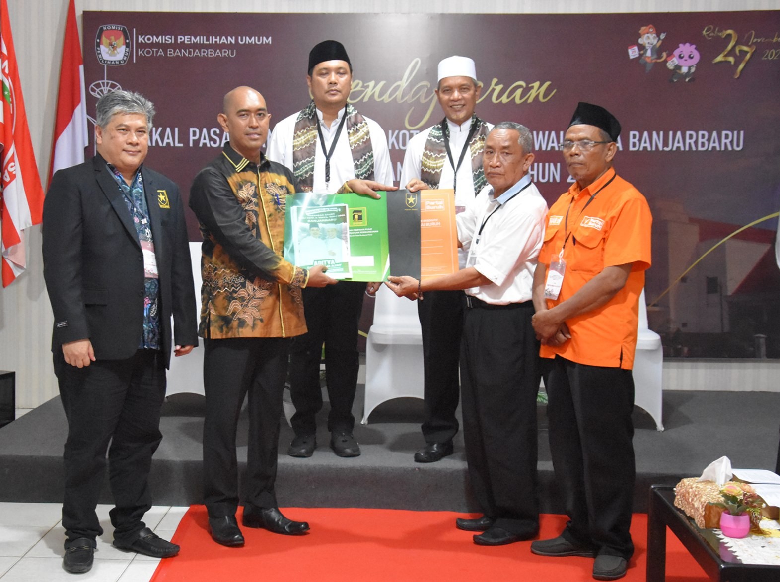 Proses penyerahan berkas pendaftaran diserahkan oleh ketua Tim pemenangan beserta Partai Politik Pendukung dan diterima langsung oleh Ketua dan seluruh Komisioner KPU Banjarbaru untuk selanjutnya dilakukan pemeriksaan berkas pendaftaran oleh Tim verifikasi dari KPU Banjarbaru.