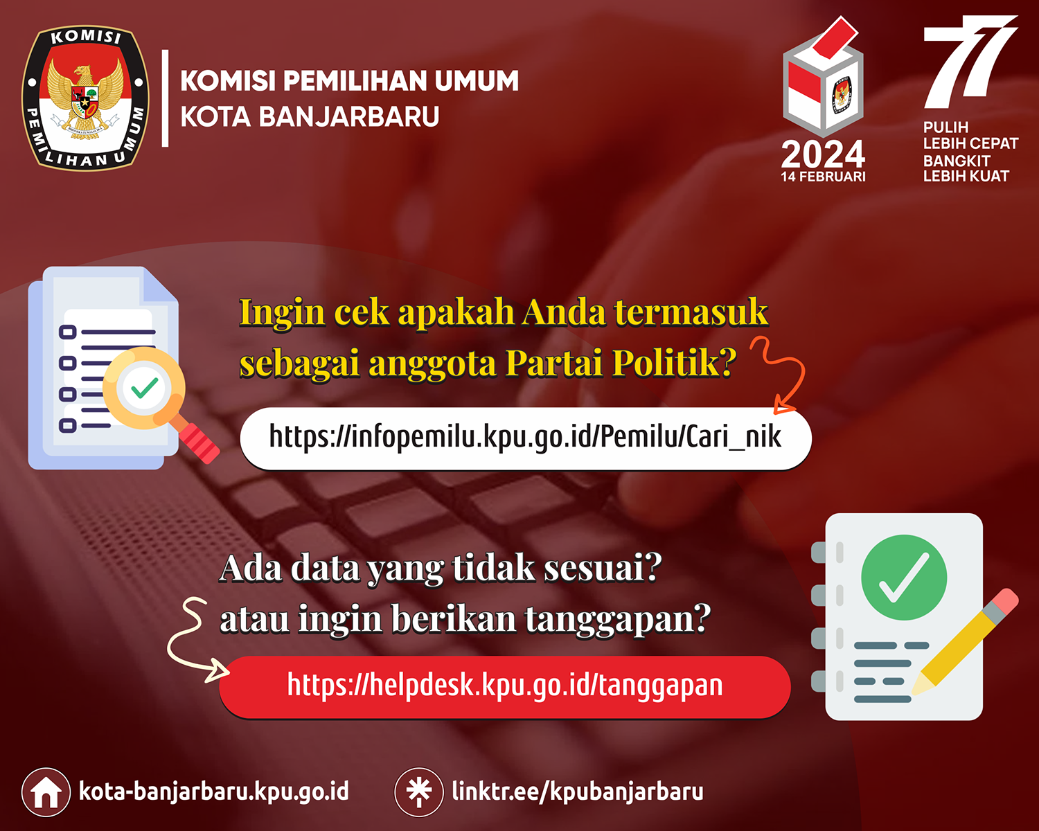 Kini masyarakat dapat melakukan pengecekan apakah tercantum atau tidak sebagai anggota Parpol tertentu. Caranya adalah melalui layanan Info Pemilu, yakni melalui alamat url https://infopemilu.kpu.go.id/Pemilu/Cari_nik
