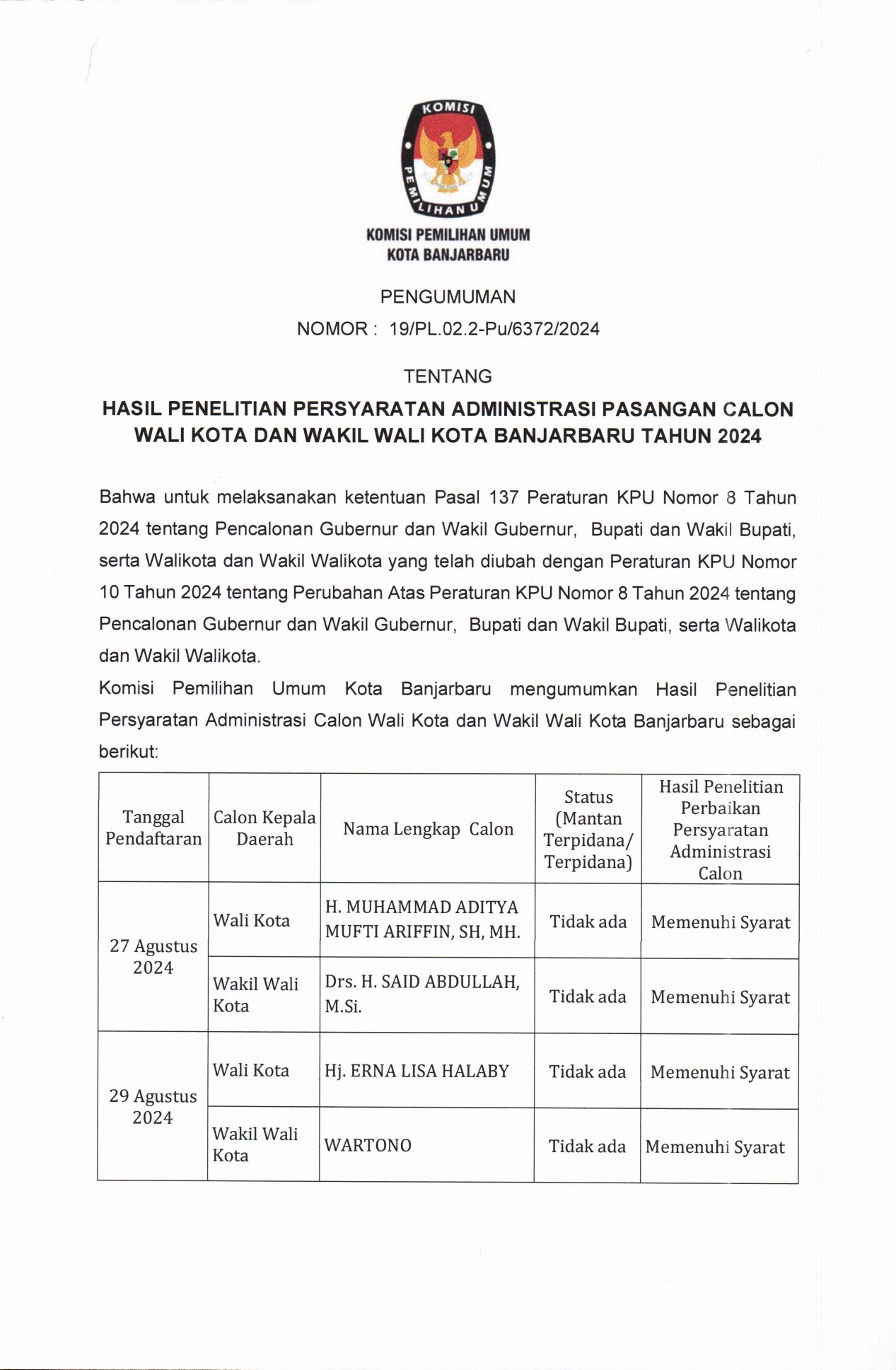 Berikut kami sampaikan Pengumuman Komisi Pemilihan Umum Kota Banjarbaru, Nomor : 19/PL.02.2-Pu/6372/2024 Tanggal 14 September 2024, Tentang Hasil Penelitian Persyaratan Administrasi Pasangan Calon Wali Kota dan Wakil Wali Kota Banjarbaru Tahun 2024