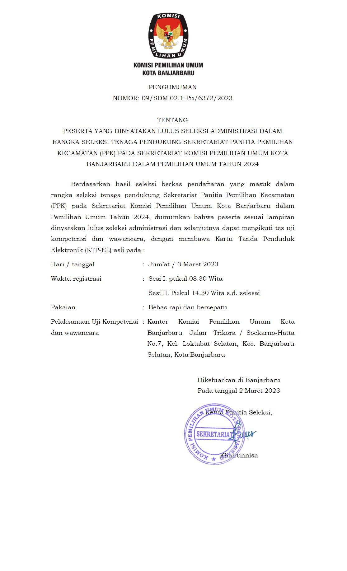 Berikut kami sampaikan Pengumuman Sekretariat KPU Kota Banjarbaru Nomor : 09/SDM.02.1-Pu/6372/2023 Tentang Peserta Yang Dinyatakan Lulus Seleksi Adminstrasi Dalam Rangka Seleksi Tenaga Pendukung Sekretariat Panita Pemilihan Kecamatan (PPK) Pada Sekretariat Komisi Pemilihan Umum Kota Banjarbaru Pada Pemilihan Umum Tahun 2024