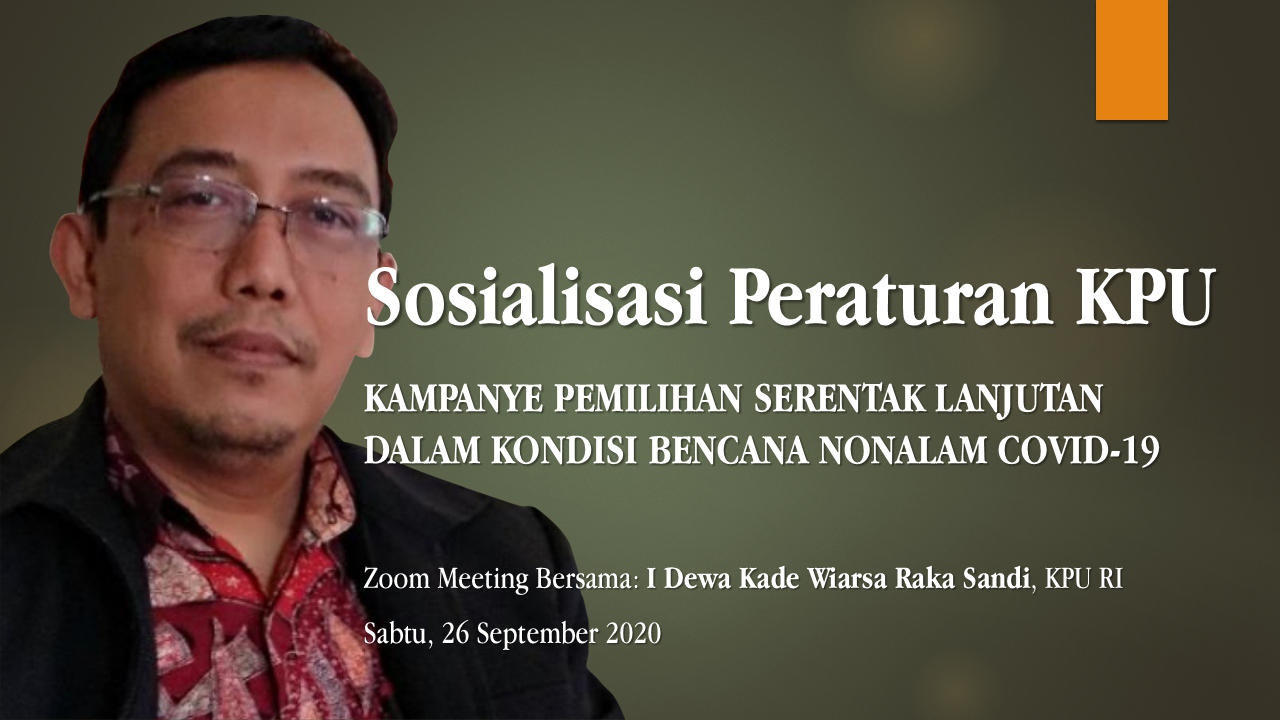 Sabtu (26/09) siang, KPU Republik Indonesia melaksanakan Sosialisasi Peraturan KPU tentang Kampanye Pemilihan Serentak Lanjutan dalam Kondisi Bencana Nonalam COVID-19. Sosialisasi ini dilaksanakan pasca terbitnya Peraturan KPU Nomor 11 Tahun 2020 dan Peraturan KPU Nomor 13 Tahun 2020.