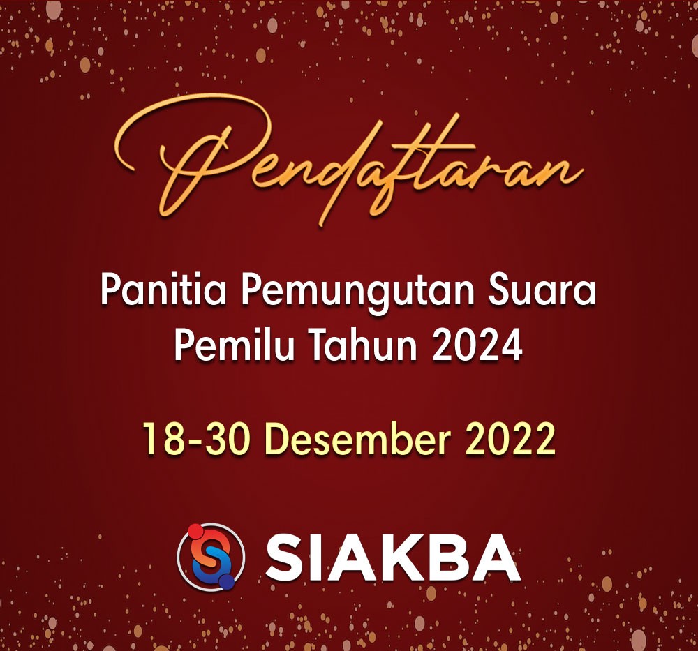 - Pendaftaran dilakukan melalui SIAKBA dengan url https://siakba.kpu.go.id paling lambat pada tanggal 30 Desember 2022, dengan ketentuan pembuatan akun SIAKBA paling lambat pada pukul 16.00 dan unggah dokumen kelengkapan persyaratan dilakukan paling lambat pukul 23.59.