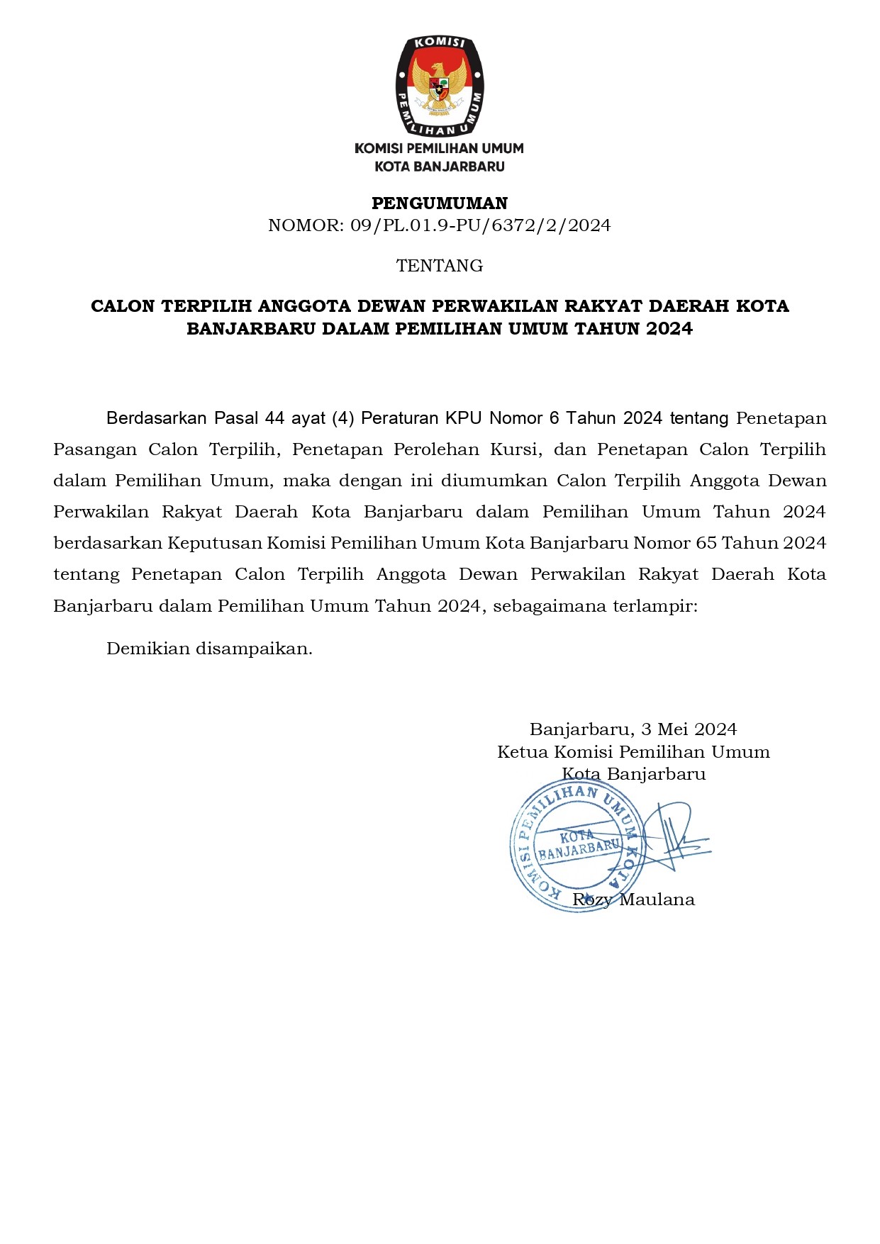 Pengumuman Calon Terpilih Anggota Dewan Perwakilan Daerah (DPRD) Kota Banjarbaru.