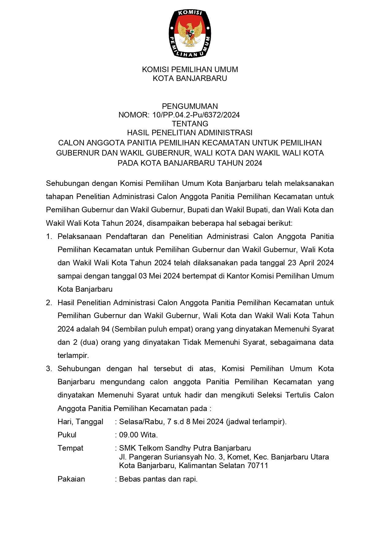 Berikut kami sampaikan Hasil Penelitian Administrasi Calon Anggota Panitia Pemilihan Kecamatan untuk Pemilihan Gubernur dan Wakil Gubernur Provinsi Kalimantan Selatan, Bupati dan Wakil Bupati, dan Wali Kota dan Wakil Wali Kota Banjarbaru Tahun 2024