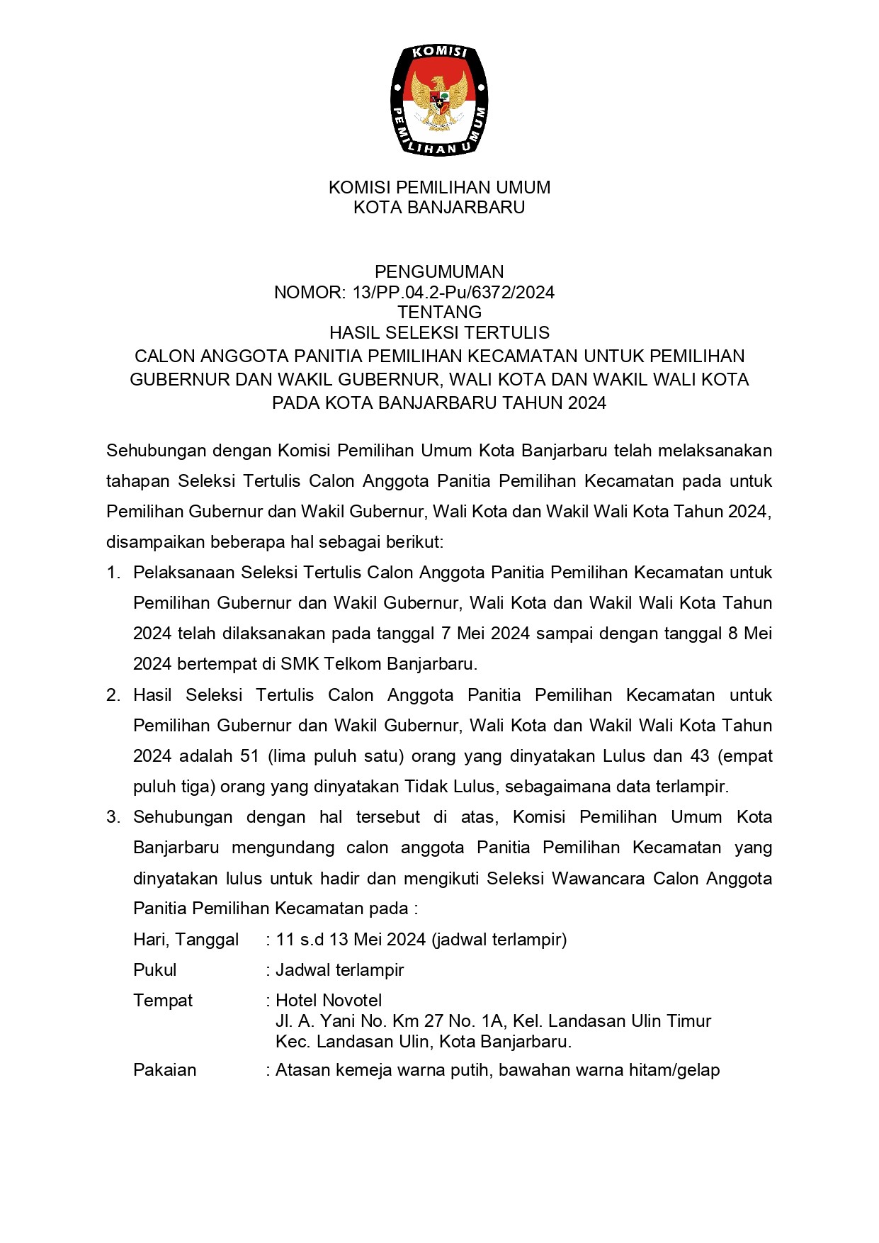 PENGUMUMAN NOMOR: 13/PP.04.2-Pu/6372/2024 TENTANG HASIL SELEKSI TERTULIS CALON ANGGOTA PANITIA PEMILIHAN KECAMATAN UNTUK PEMILIHAN GUBERNUR DAN WAKIL GUBERNUR, WALI KOTA DAN WAKIL WALI KOTA PADA KOTA BANJARBARU TAHUN 2024