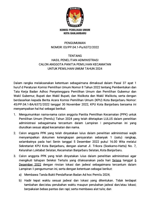 Berikut kami sampaikan nama nama calon anggota Panitia Pemilihan Kecamatan (PPK) yang telah ditetapkan LULUS dalam penelitaian administrasi sebagaimana tercantum dalam lampiran pengumuman ini.Pengumuman KPU Kota Banjarbaru No.03/PP.04.01.Pu/6372/2022 Tentang Hasil Penelitian Administrasi Calon Anggota Panitia Pemilihan Kecamatan (PPK) untuk Pemilihan Umum Tahun 2024 (Terlampir)