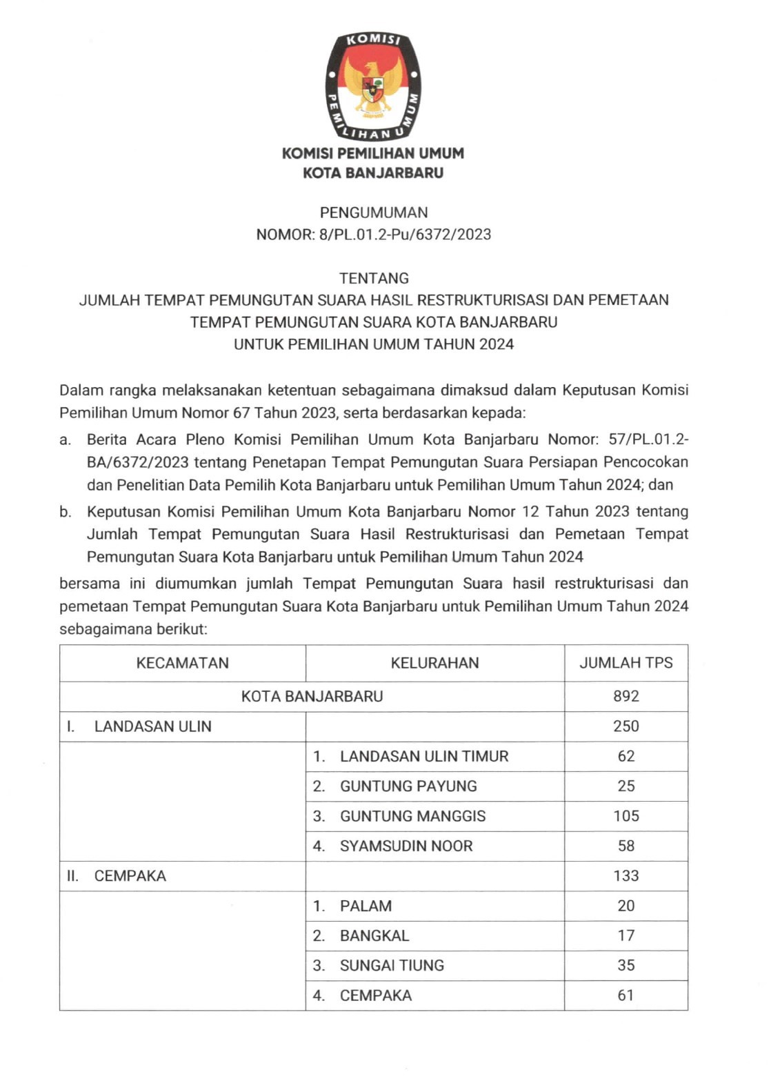 Berikut kami sampaikan Pengumuman KPU Kota Banjarbaru Nomor : 8/PL.01.2-Pu/6372/2023, tentang Jumlah Tempat Pemungutan Suara Hasil Restrukturisasi dan Pemetaan Tempat Pemungutan Suara Kota Banjarbaru Untuk Pemilihan Umum Tahun 2024.