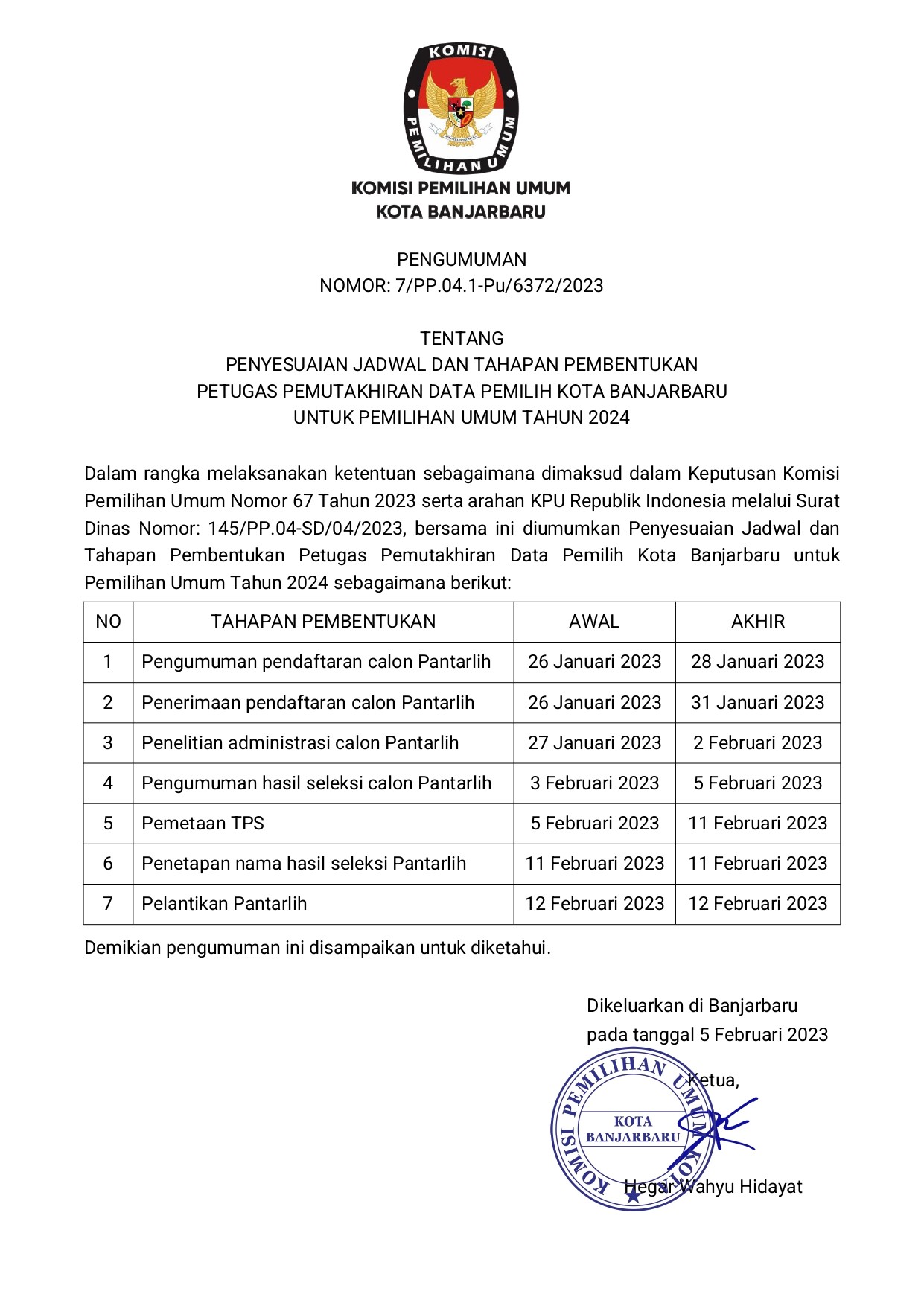 Pengumuman KPU Kota Banjarbaru Nomor: 7/PP.04.1-Pu/6372/2023 tentang Penyesuaian Jadwal dan Tahapan Pembentukan Petugas Pemutakhiran Data Pemilih Kota Banjarbaru untuk Pemilihan Umum Tahun 2024