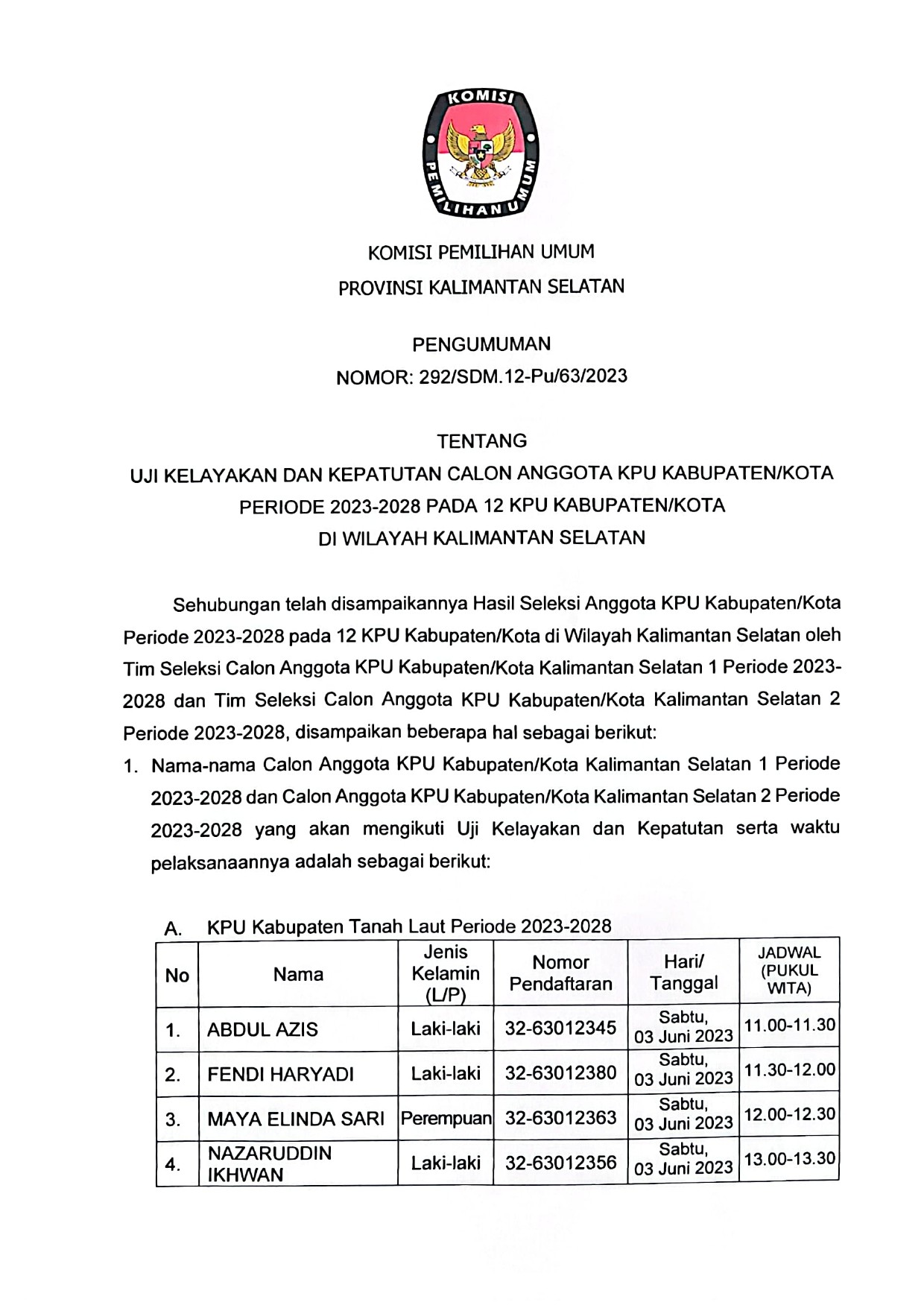 Pengumuman KPU Provinsi Kalimantan Selatan Nomor 292/SDM.12-Pu/63/2023 Tentang Uji Kelayakan dan Kepatuhan Calon Anggota KPU Kabupaten/Kota Periode 2023-2028 Pada 12 KPU Kabupaten/Kota Di Wilayah Provinsi Kalimantan Selatan