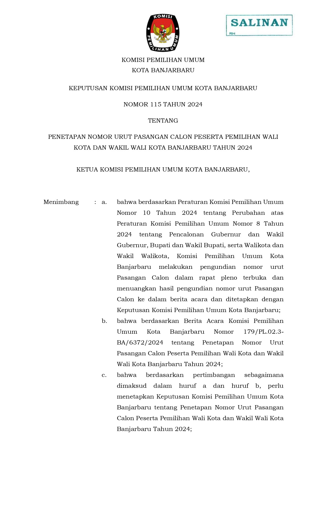 Berikut kami sampaikan Pengumuman melalu Surat Keputusan Komisi Pemilihan Umum Kota Banjarbaru Nomor 115 Tahun 2024 Tentang Penetapan Nomor Urut Pasangan Calon Wali Kota dan Wakil Wali Kota Banjarbaru pada Pemilihan Serentak Tahun 2024.