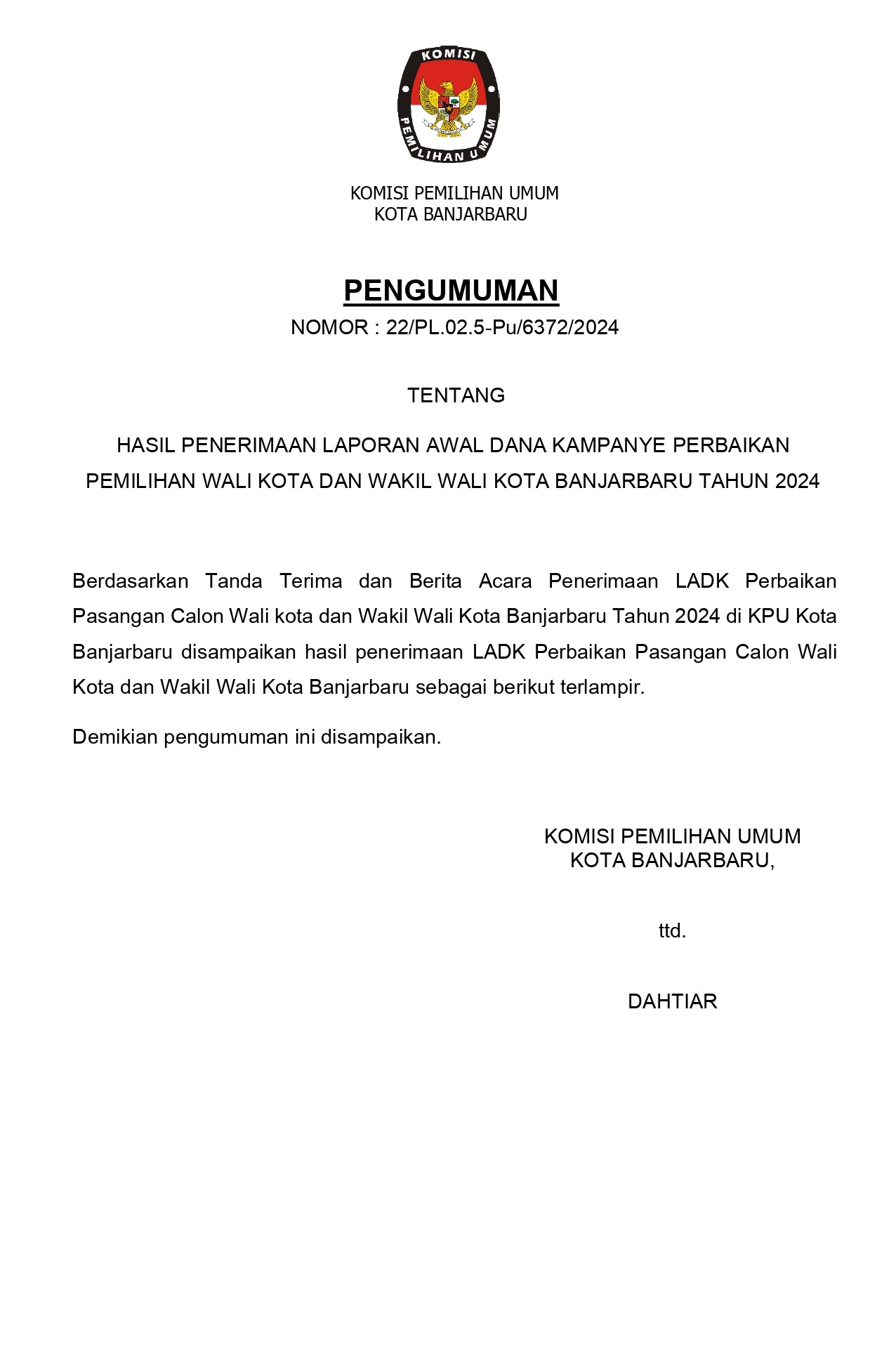 Pengumuman Tentang Hasil Penerimaan Laporan Awal Dana Kampanye Perbaikan Pemilihan Wali Kota dan Wakil Wali Kota Bnjarbaru Tahun 2024.