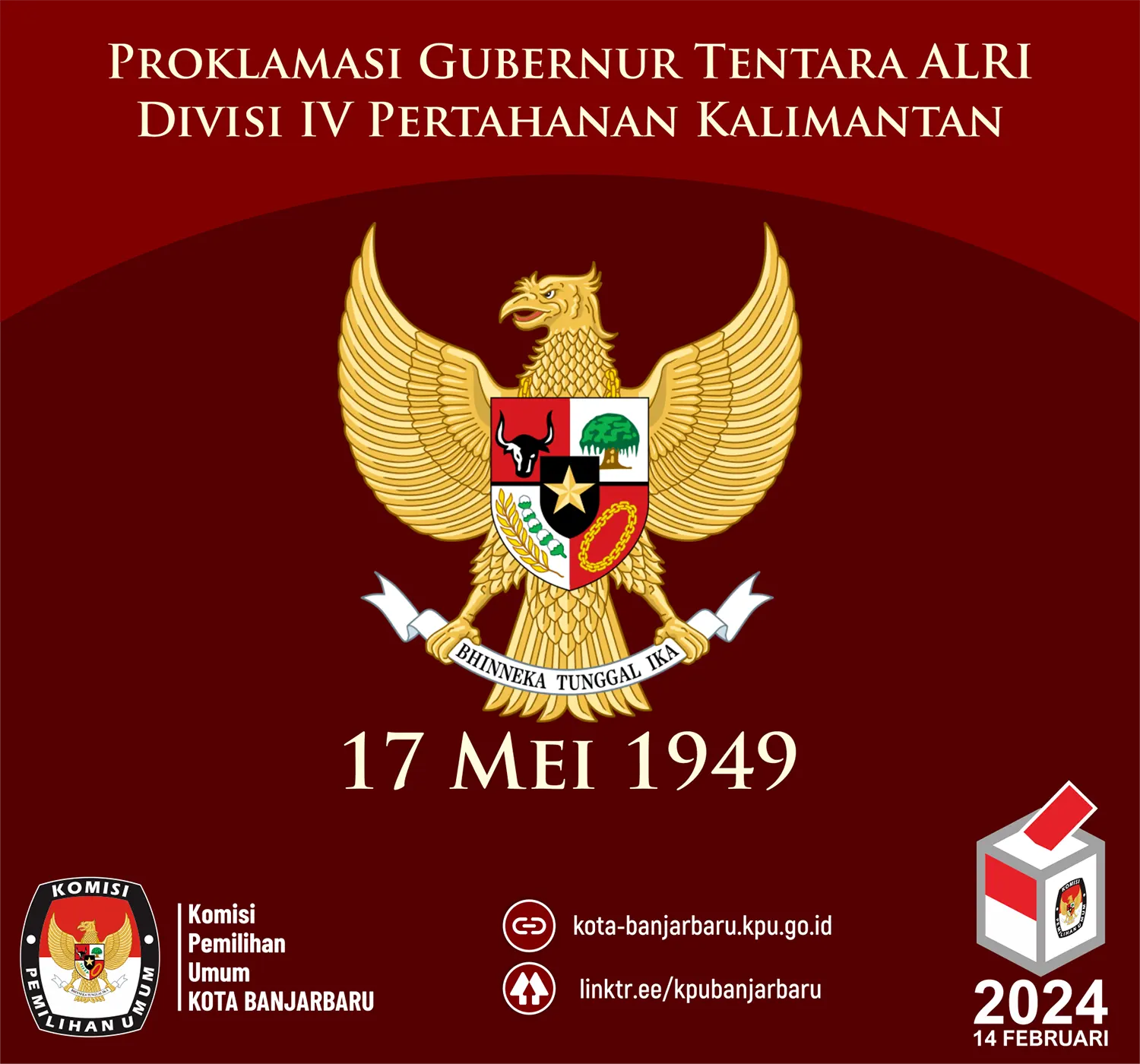 KPU Kota Banjarbaru menyampaikan selamat memperingati Proklamasi 17 Mei 1949 ke-73 Tahun 2022 kepada seluruh masyarakat Kalimantan Selatan. Semoga momen 17 Mei 2022 ini meneguhkan kembali semangat kemerdekaan dan persatuan di antara kita semua.