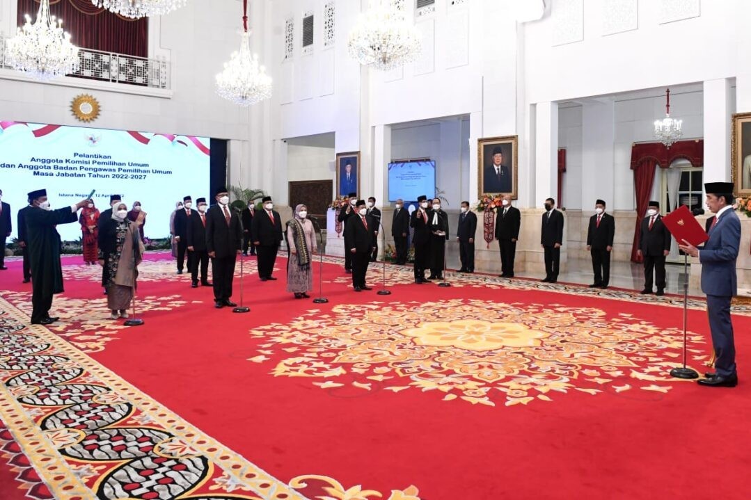 Jakarta - Presiden Joko Widodo melantik dan mengambil sumpah jabatan anggota Komisi Pemilihan Umum (KPU) dan Badan Pengawas Pemilihan Umum (Bawaslu) masa jabatan tahun 2022-2027. Acara pelantikan berlangsung di Istana Negara, Jakarta, pada Selasa, 12 April 2022 dengan menerapkan protokol kesehatan ketat.