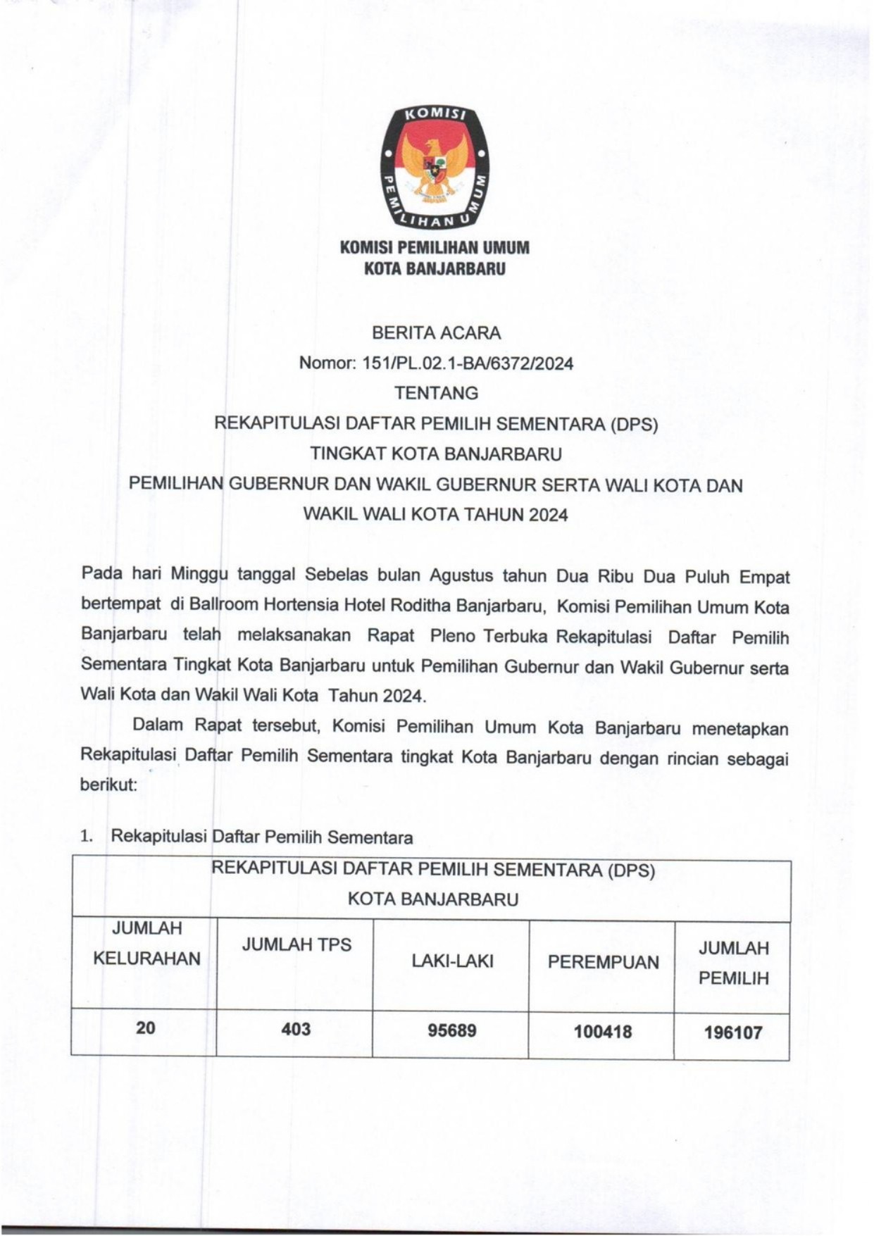 Berikut kami sampaikan Berita Acara KPU Kota Banjarbaru, Nomor : 151/PL/.02.1-BA/6372/2024 Tentang Rekapitulasi Daftar Pemilih Sementara (DPS) Tingkat Kota Banjarbaru pada Pemilihan Gubernur dan Wakil Gubernur serta Wali Kota dan Wakil Wali Kota Banjarbaru Tahun 2024