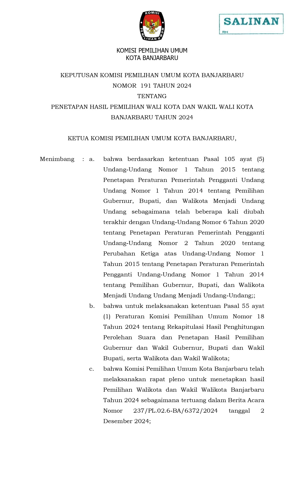 Berikut kami sampaikan Salinan SK KPU Kota Banjarbaru, Nomor 191 Tahun 2024 Tentang Penetapan Hasil Pemilihan Wali Kota dan Wakil Wali Kota Banjarbaru Tahun 2024