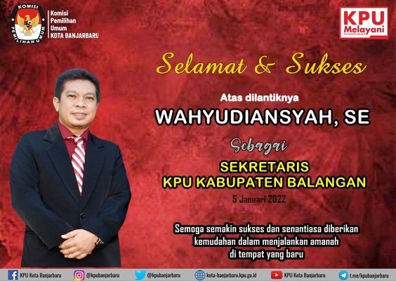 Segenap jajaran Komisi Pemilihan Umum (KPU) Kota Banjarbaru mengucapkan selamat dan semoga sukses kepada Wahyudiansyah, SE. yang pada tanggal 5 Januari 2022 dilantik secara resmi sebagai Sekretaris KPU Kabupaten Balangan.