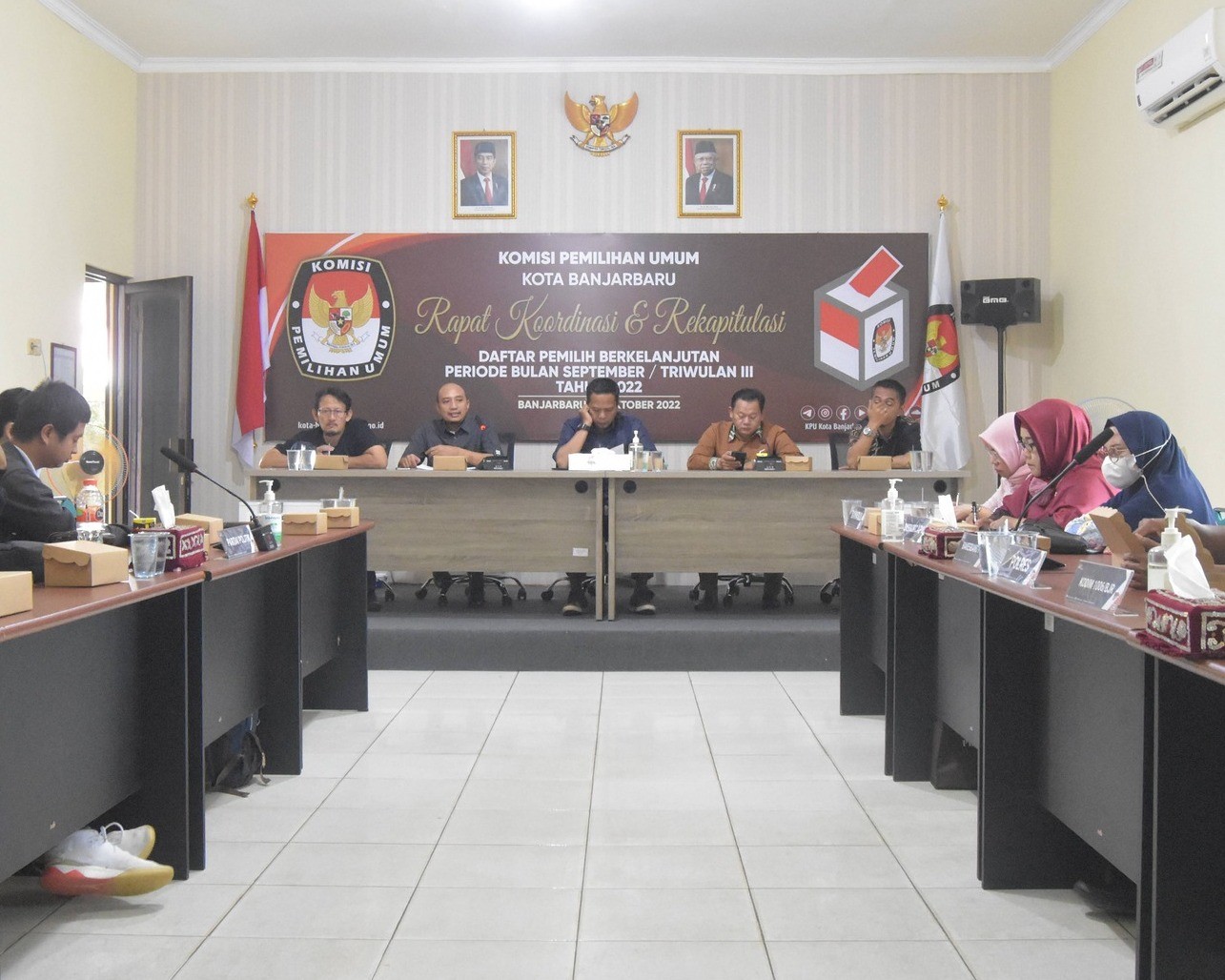 Jelang tahapan pemutakhiran data Pemilih untuk Pemilu 2024, KPU Kota Banjarbaru kembali melaksanakan rapat koordinasi sekaligus rekapitulasi Daftar Pemilih Berkelanjutan (DPB) Kota Banjarbaru periode September/Triwulan III tahun 2022. Rekapitulasi DPB periode September 2022 ini merupakan penutup dalam kegiatan pemutakhiran DPB tahun 2022. Karena Sesuai dengan PKPU 3 tahun 2022 tentang tahapan pemilu 2024, bahwa Bulan Oktober tahun 2022 ini telah memasuki tahapan pemutakhiran data pemilih untuk Pemilu 2024.